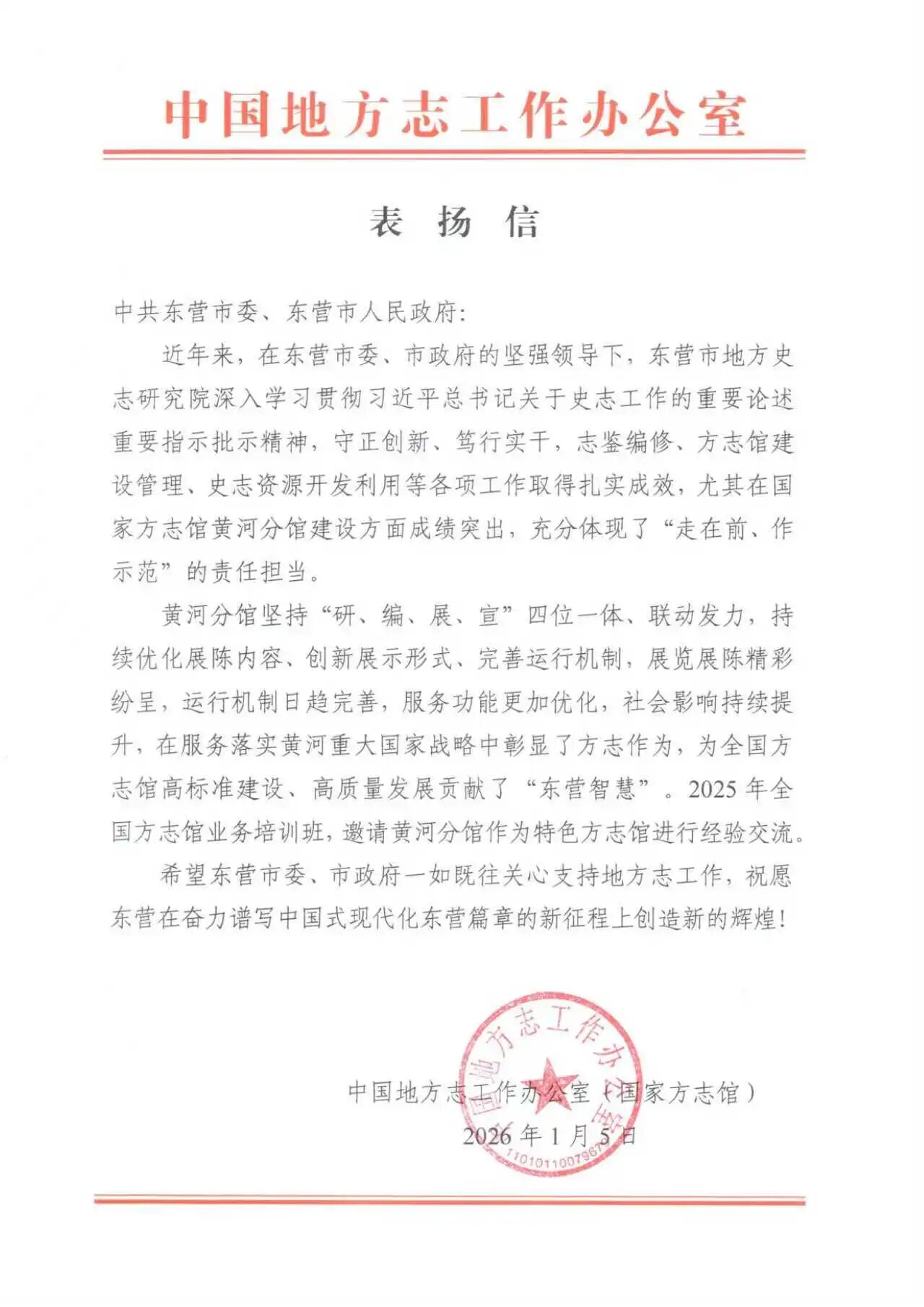 近日,中国地方志工作办公室(国家方志馆)向东营市委、市政府发来《表扬信》,对我市志鉴编修、方志馆建设管理、史志资源开发利用等各项工作给予充分肯定并提出表扬。这是东营市地方史志研究院(国家方志馆黄河分馆)连续第二年获此表扬。《表扬信》说:“近年来,在东营市委、市政府的坚强领导下,东营市地方史志研究院深入学习贯彻习近平总书记关于史志工作的重要论述重要指示批示精神,守正创新、笃行实干,志鉴编修、方志馆建设管理、史志资源开发利用等各项工作取得扎实成效,尤其在国家方志馆黄河分馆建设方面成绩突出,充分体现了“走在前、作示范”的责任担当。黄河分馆坚持“研、编、展、宣”四位一体、联动发力,持续优化展陈内容、创新展示形式、完善运行机制,展览展陈精彩纷呈,运行机制日趋完善,服务功能更加优化,社会影响持续提升,在服务落实黄河重大国家战略中彰显了方志作为,为全国方志馆高标准建设、高质量发展贡献了“东营智慧”。2025年全国方志馆业务培训班,邀请黄河分馆作为特色方志馆进行经验交流。希望东营市委、市政府一如既往关心支持地方志工作,祝愿东营在奋力谱写中国式现代化东营篇章的新征程上创造新的辉煌!”。